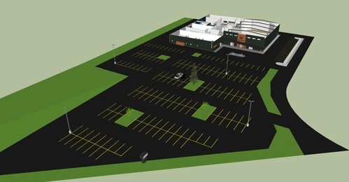 230 parking spaces added to the south lot, lighting, and green space with trees, a second driveway near AA, and removing the curb from the current lot.