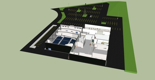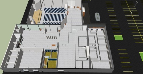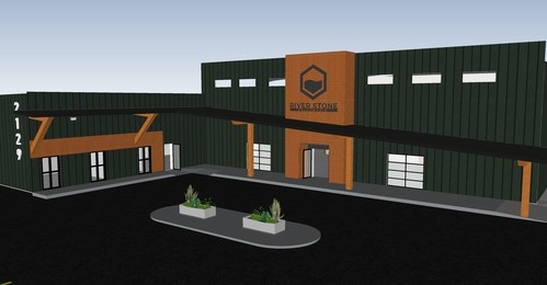 A new foyer and front entryway facing south will be bulilt, adding a full awning for shade and cover from rain. Two overhead glass panel doors will be added on for additional daylight and to create an open flow of traffic on nice days. Windows along the top will also add daylight. The building sign will be reused along with the wood planks. The addition of a circle drive and some planters will be created for a protected drop off area. The entire building will get new metal siding.