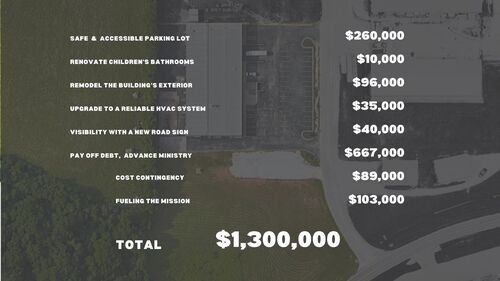 Addition of 10,675 feet including a foyer and 550 seat Worship Center (Current Worship Center has 318 chairs). The current Foyer and Worship Center will be remodeled to add KIDS classroom and a larger Student Ministry room. The wall that separates the current STUDENTS room will be removed to make for a larger fellowship area.